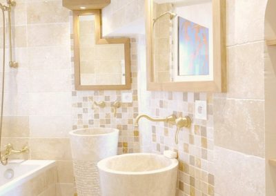 Elle dispose d’un lit de 160 cm et d’une salle de bains avec baignoire et douche à l’italienne.